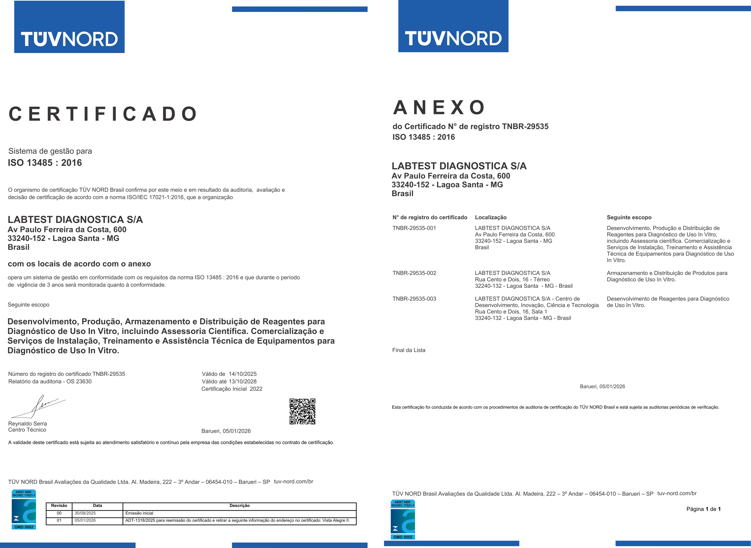 Em 50 anos de história, a empresa conquistou algumas das certificações mais importantes no ramo de diagnósticos in vitro. Reconhecimentos que certificam a qualidade global da Labtest.