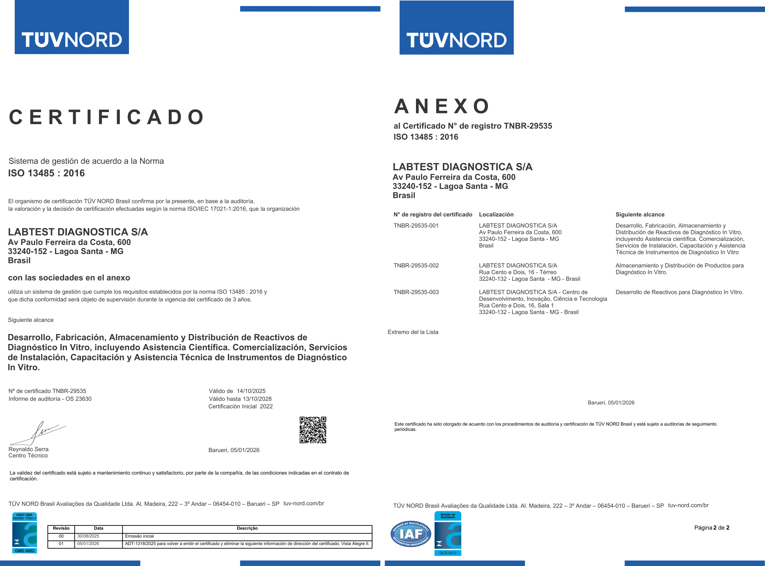 Certificado de Conformidad al Sistema de Gestión de Productos para la Salud ISO 13485. Conferido por TÜV NORD.